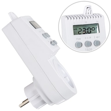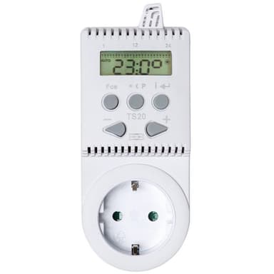 TS20 är ett digitalt temperaturstyrt vägguttag för automatisk styrning av elektriska värmesystem (direktverkande elelement, handdukstorkar, kaminer) i villor, lägenheter och kontor. Upp till sex tidsintervall med tre temperaturnivåer kan ställas in för varje dag.
