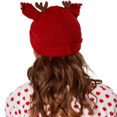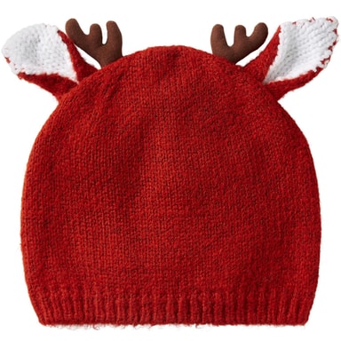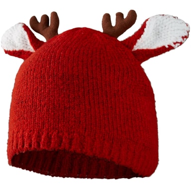 Här kommer Rudi: Med den röda renmössan kommer du att kännas igen på långt håll - och beundras. De välformade öronen är vita inuti. Det söta lilla hornet är brunt. Mössans kant är ribbstickad och kan vikas upp. Den röda renmössan gör ditt huvud till ett snyggt blickfång och håller dig varm, Material: akryl.