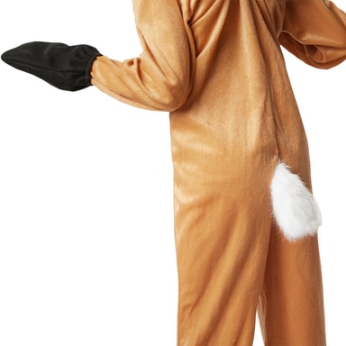 Unisex-dräkten Rasande ren i ett stycke består av en overall, en huva, handskar samt skor. Dräkten är bearbetad av ockerfärgat plyschtyg. Magen och bröstet pryds av en vit bräm av konstpäls. Overallen knäpps i ryggen med en lång dragkedja. Under dragkedjan finns en liten, stilren hjortsvans. Huvan knäpps och öppnas vid halsen med hjälp av kardborreband. Med påsydda öron och horn. Dräkten kompletteras av matchande handskar och skor av mörk filt med gummiresår, material: 100 % polyester.