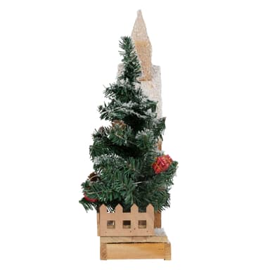 Dekorativt julhus täckt av snö med LED-belysning, tillverkat av träLäs mer om produkten