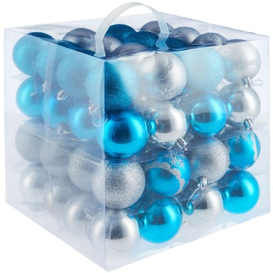 Detta set med 64 julgranskulor i blått och silver från tectake kommer att skapa en underbar julstämning. Julkulorna kommer med tre olika texturer såsom matt, glänsande eller glittrande. Ett speciellt blickfång är kulorna som pryds av silverglittrande snöflingor. Det här julgranspyntet garanterar variation på grenarna och ger hela granen ett enhetligt och strålande vackert utseende. Trots den låga vikten är kulorna mycket robusta och krossäkra.