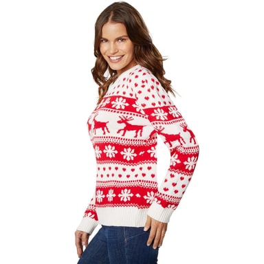 Den tvåfärgade jultröjan Vintermagi är perfekt för dig som älskar den kalla årstiden. De många tvärgående ränderna av snöflingor, frostblommor och renar ger detta mjuka plagg en egen och originell charm. Den runda halsringningen och midjemudden på detta klassiskt designade plagg har en mjuk ribbstickning. Den fina dubbelstickningen ger hög bärkomfort och härlig värme, Material: 100 % akryl.