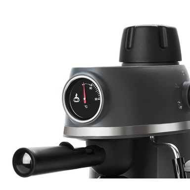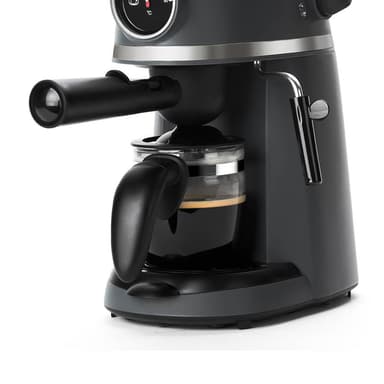 Hydrotrycksmaskin med 0,24 liters glaskanna, lämplig för att göra upp till 4 koppar kaffe. Med en modern och elegant finish i svart och en designertermometer på framsidan som visar kaffetemperaturen. Med 3,5 bar tryck och 800W effekt.