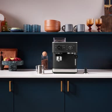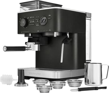 Brygg espresso av kafékvalitet med KitchenAids espressomaskin 5KES6551EBK som har en inbyggd kvarn, 15 bars pumptryck och ett ångmunstycke med flera vinklar. Den har också en löstagbar bönbehållare och en 2,5 liters vattentank för enkel påfyllning.Läs mer om produkten