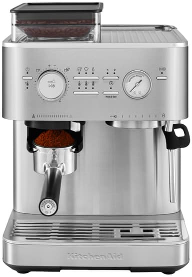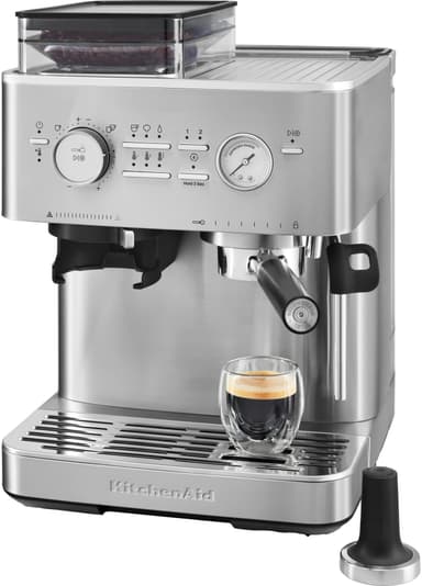 Brygg espresso av kafékvalitet med KitchenAids espressomaskin 5KES6551ESX som har en inbyggd kvarn, 15 bars pumptryck och ett ångmunstycke med flera vinklar. Den har också en löstagbar bönbehållare och en 2,5 liters vattentank för enkel påfyllning.Läs mer om produkten