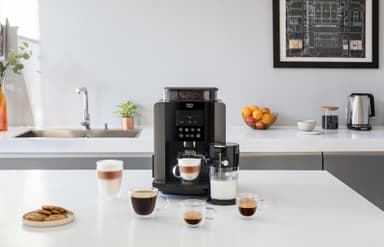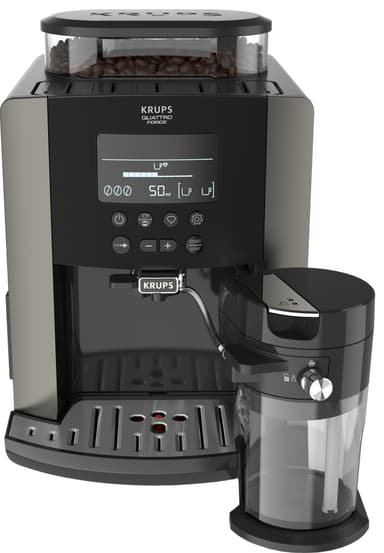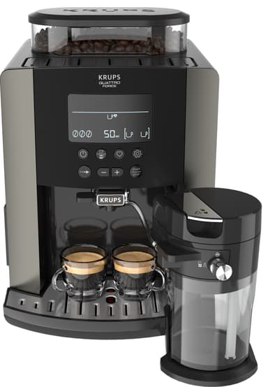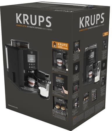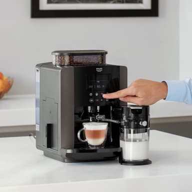 Helautomatiska Krups Arabica Latte espressomaskin EA819E10 förbereder olika kaffedrycker på nolltid tack vare sin intuitiva drift med användarvänliga kontroller och en stor LCD-skärmLäs mer om produkten