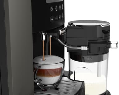 LCD skärm Den breda LCD-skärmen garanterar en enastående användarupplevelse. Välj din dryck, intensitet samt kaffe- eller mjölkkvantitet.