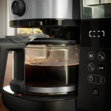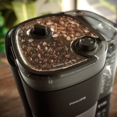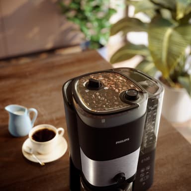 Philips All-in-1 Brew Drip HD7900/01 maler färska bönor och brygger i valfri kopp eller kanna, vilket garanterar perfekt dosering. Har dubbel bönbehållare, droppstopp, avtagbar tank för 10 koppar och automatisk avstängning.Läs mer om produkten