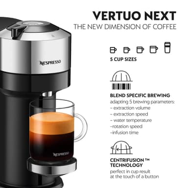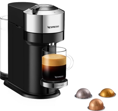 Njut av en utsökt kopp kaffe med NESPRESSO® Vertuo Next kaffemaskin av DeLonghi, som har en kapacitet på 1,1 liter, 5 olika koppstorlekar och Nespressos innovativa Centrifusion-bryggsystem.Läs mer om produkten