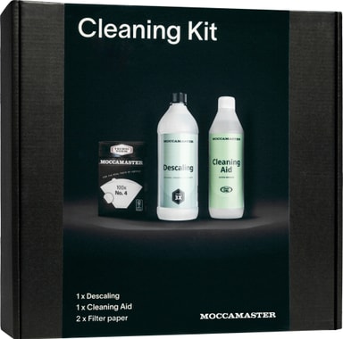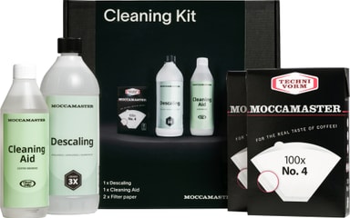Moccamasters avkalknings- och rengöringskit för kaffebryggare säkerställer optimal prestanda med återanvändbart avkalkningsmedel, luktfritt rengöringsmedel och 100 slitstarka filterpapper nr 4.Läs mer om produkten