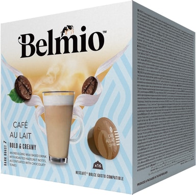 Belmio Café Au Lait kaffekapslar för Dolce Gusto erbjuder ett fylligt, mjölkbaserat kaffe med kraftfulla smaker av kola, choklad och en touch av nötighet. Kommer i en förpackning med 16 kaffekapslar som är kompatibla med Dolce Gusto-maskiner.Läs mer om produkten