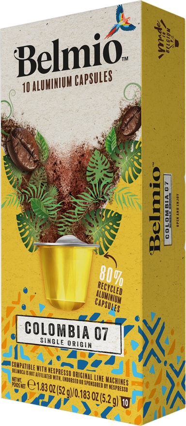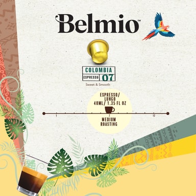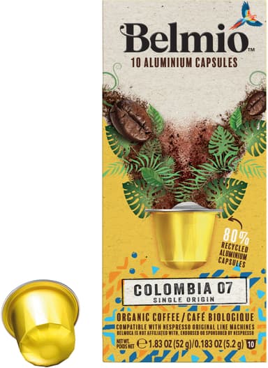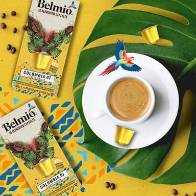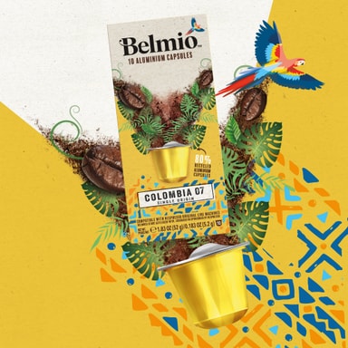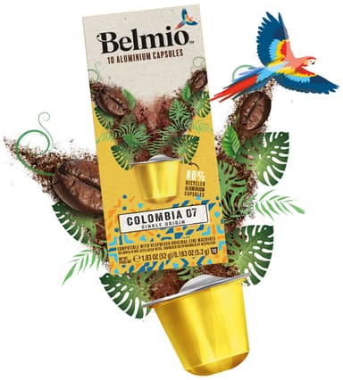 Belmio Columbia-kaffekapslar för Nespresso ger en len, ekologisk espresso med fylliga colombianska Arabicabönor, med inslag av rostad mandel och en touch av grapefrukt. Nespresso-kompatibel och förpackad i aluminium.Läs mer om produkten