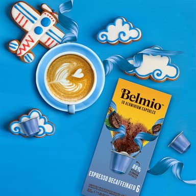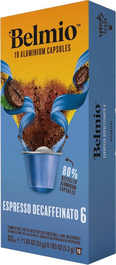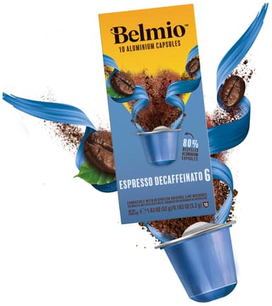 Belmio Espresso Decaffeinato kapslar för Nespresso är ett mjukt, mellanrostat, koffeinfritt kaffe med intensitet 6. Tillverkat av en balanserad blandning med fruktiga, cedertoner och en rödvinliknande arom.Läs mer om produkten