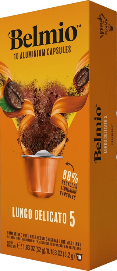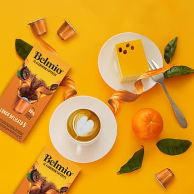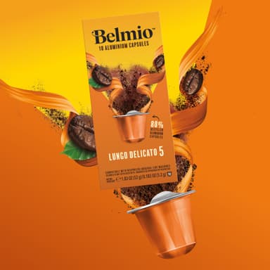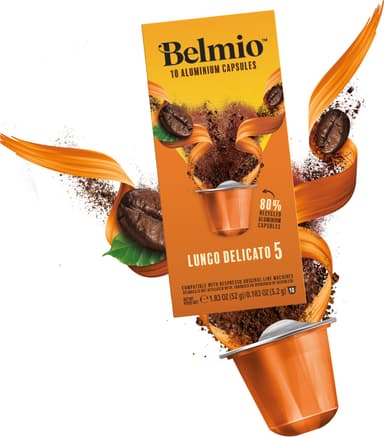 Belmio Lungo Delicato kaffekapslar för Nespresso erbjuder ett lent, milt kaffe med en intensitet på 5. Tillverkade av lättrostade sydamerikanska och afrikanska Arabicabönor, levererar de en mild, välbalanserad smak med söta toner.Läs mer om produkten