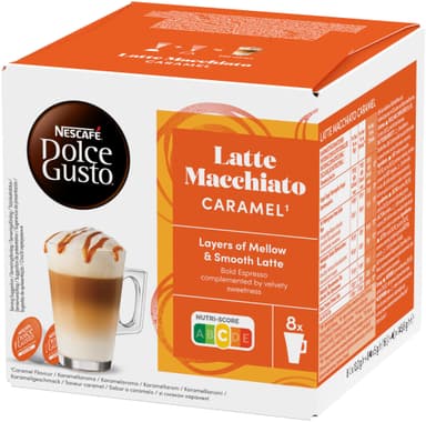 NESCAFÉ Dolce Gusto Caramel Latte Macchiato är en karamellinfunderad mjölk balanserad med en blandning av ren premium Arabica och Robusta. Du får även mjuk kaffesmak eftersom det är en espresso latte macchiato, som är mer mjölk-framåtriktadLäs mer om produkten