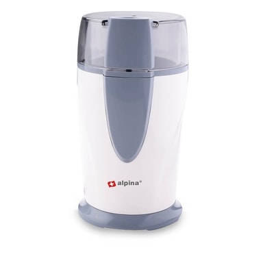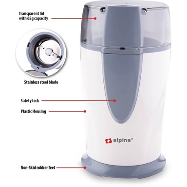 Kaffekvarn med genomskinligt lock och halkfria gummifötter.