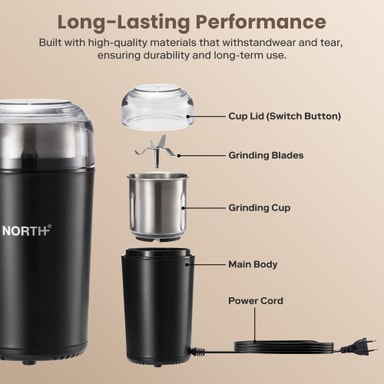 North kaffekvarn 205108 har en kraftfull 200-watts motor, manuell malningskontroll och en lättrengjord kopp i rostfritt stål. Kompakt, säker och perfekt för snabb och precis malning av kaffebönor.Läs mer om produkten
