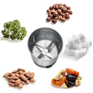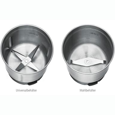 Inklusive: 2 utbytbara behållare i rostfritt stål, kapacitet 70 g: kvarnkopp med 2-vingat blad av rostfritt stål, universalkopp med 4-vingat specialblad av rostfritt stål, kaffeskopa med rengöringsborste