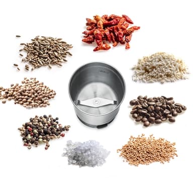 Den eleganta krydd- och kaffekvarnen från Rommelsbacher är perfekt för att mala och krossa kaffebönor, kryddor, örter, nötter, spannmål och mer. De två olika arbetsbehållarna kan användas på olika sätt: I kvarnkoppen produceras nymalet kaffepulver och torkade kryddor som pepparkorn, koriander, kummin och även socker och salt pulveriseras på nolltid. Den universella koppen är perfekt för att hacka färska örter eller förbereda en liten portion färsk pesto.