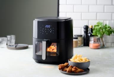 1500W Day airfryer 100543 kommer med en kapacitet på 6,5 l och 8 förinställningar. Dessutom har den en LED-pekskärm, ett LED-fönster och stöder ett temperaturområde på 65-200°C.Läs mer om produkten