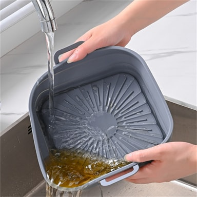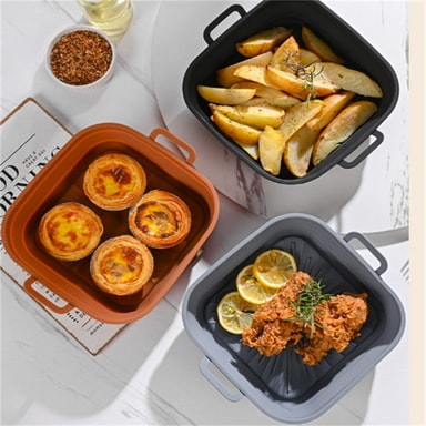 Fyrkantig form av livsmedelsgodkänt silikon. Den passar perfekt in i fritösen och förhindrar klibbiga och fastbrända matrester i din Air Fryer. Behållaren är återanvändbar och kan diskas i maskin. Den upphöjda kanten håller maten på plats och fångar upp smulor och överflödigt fett. Formen kan tryckas ihop så den tar mindre plats när den inte används.
