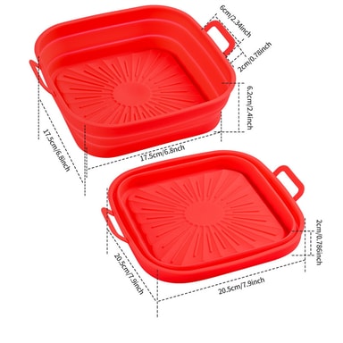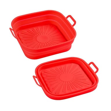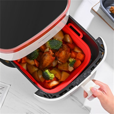 Fyrkantig form av livsmedelsgodkänt silikon. Den passar perfekt in i fritösen och förhindrar klibbiga och fastbrända matrester i din Air Fryer. Behållaren är återanvändbar och kan diskas i maskin. Den upphöjda kanten håller maten på plats och fångar upp smulor och överflödigt fett. Formen kan tryckas ihop så den tar mindre plats när den inte används.