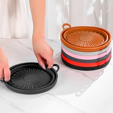 Smart design: Den räfflade ytan hjälper till att värma upp maten helt och jämt, samtidigt som överflödigt fett samlas upp. För förvaring kan skålen fällas ihop till mindre storlek.