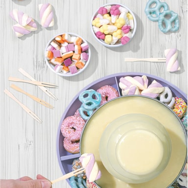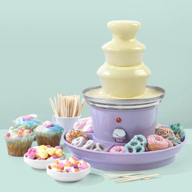 En 3-vånings Petra chokladfontän 500002, med 70–90 watt effekt och snabbfunktion håller chokladen slät och smält. Den har justerbara fötter, 2 brickor och 100 bambuspett för att doppa frukt, marshmallows och minimunkar.Läs mer om produkten
