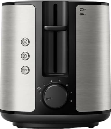 Philips Viva Collection-brödrost HD2650/90 erbjuder breda öppningar, 8 bryningsnivåer, avfrostnings- och avbrytningsfunktion med automatisk avstängning, samt en avtagbar smulbricka.Läs mer om produkten