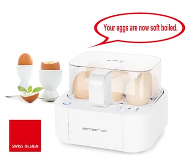 Njut av en utmärkt frukost med ägg tillagade till perfektion tack vare Emerio äggkokare EB115560. Den har en stor kapacitet på 6 ägg samt en indikatorlampa och en röstindikator som meddelar när äggen är färdiga.Läs mer om produkten