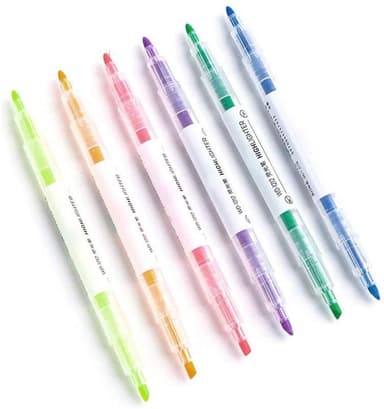 Markeringspennor i olika fäger. Pennan har olika stift på vardera sida, bredare på ena sidan för optimal markering och smal på den andra sidan.