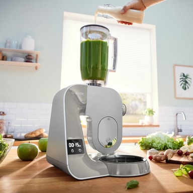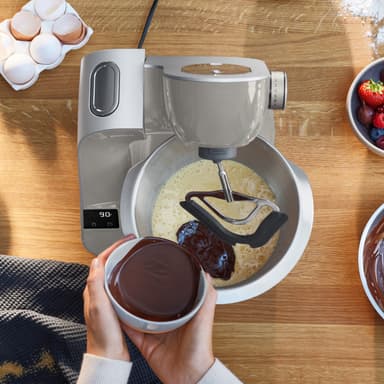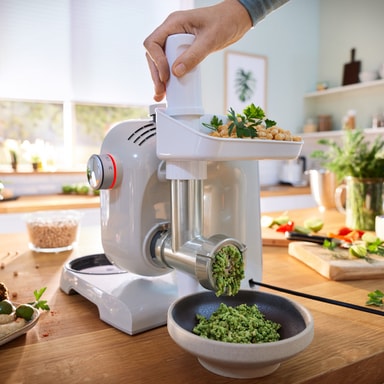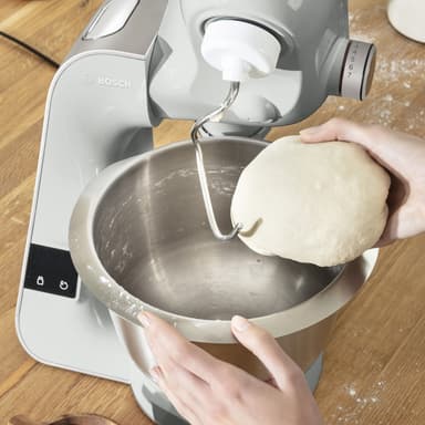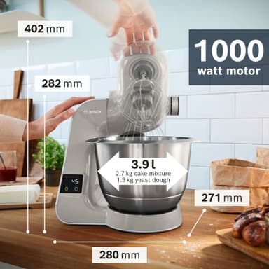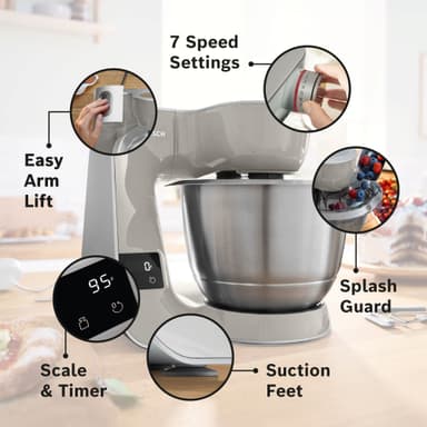 Förenkla matlagningen med Bosch Series 4 köksmaskin MUM5XL74 på 1000 watt. Med en 3,9-liters skål i rostfritt stål, en kapacitet på 2,7 kg och en BPA-fri plastskål erbjuder den 7 hastighetsinställningar för snabb och enkel blandning.Läs mer om produkten