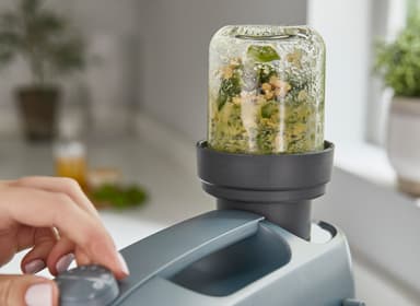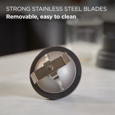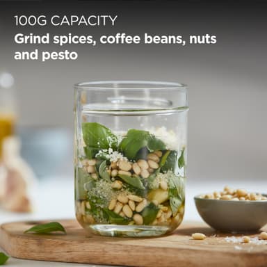 Mal upp till 100 g kryddor, kaffebönor eller nötter med hög precision med Kenwood Go-hackaren KAG30.000GY. Den levereras med två glasburkar för förberedelse eller förvaring, och löstagbara blad i rostfritt stål för enkel rengöring.Läs mer om produkten