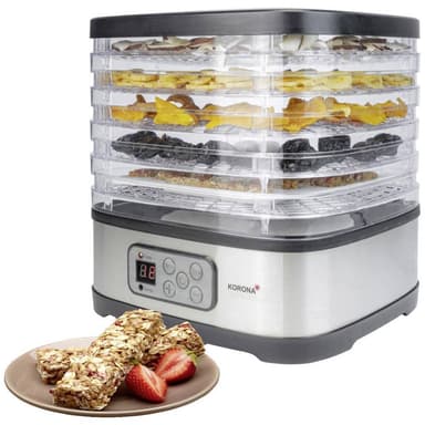 Dehydrator Korona Rostfritt stål, SvartTemperaturinställning 35 - 70 °C. Timerfunktion 8-72 timmarTorkar frukter, grönsaker, kött, fisk Inkl. Silikon-Müslibarform för skonsam framställning av hälsosammare Müslistång efter din egen smak 5 planLäs mer om produkten