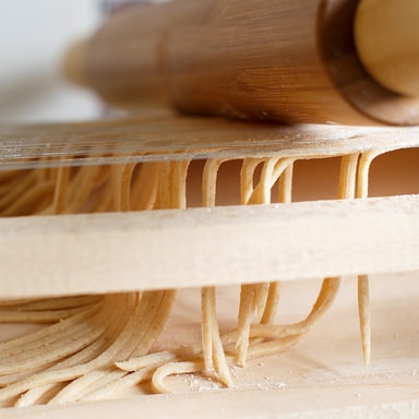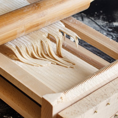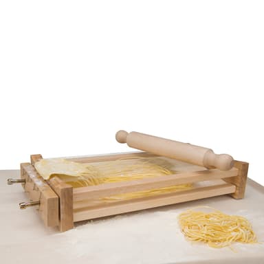 Chitarra! Finns inget enklare sätt att göra egen pasta. Kavla ut degen enligt konstens alla regler. Lägg degen på chitarran och rulla kaveln utmed strängarna. Strimlorna trillar ner undertill och plockas upp med fingrarna och läggs på en mjölad duk.Läs mer om produkten