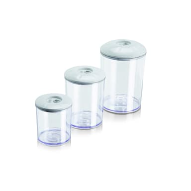 Tre stycken runda burkar med lock för vakuumpaketering med vakuumpackare från Magic Vac. Burkarna är 0.75, 1.5 respektive 3 liter. Perfekt för att förlänga hållbarheten på såser, soppor, sallad eller grönsaker.Läs mer om produkten