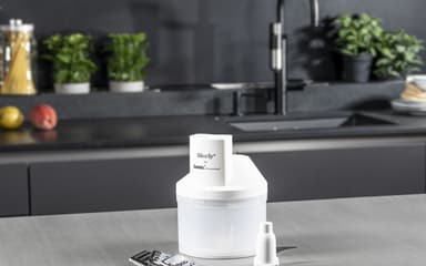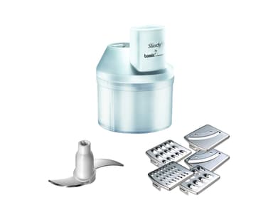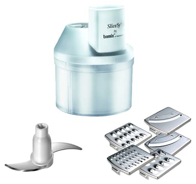 bamix®-tillbehör. SliceSy® för att hacka, riva, skära och mala – allt klart på halva tiden. Kan även användas för att röra och blanda deg. Produkten har en kapacitet på ca 6 dl och levereras med 5 knivbladLäs mer om produkten