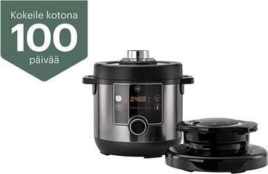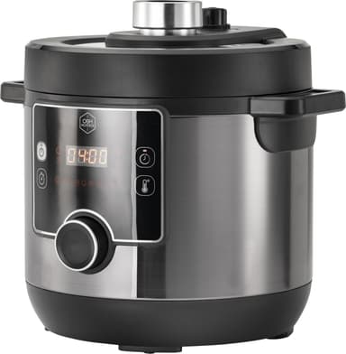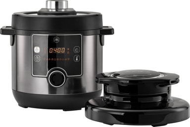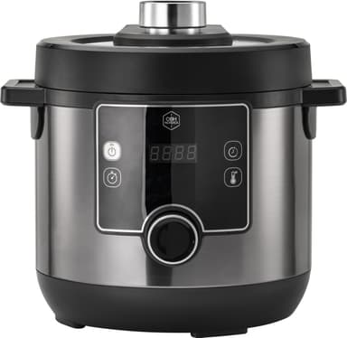 OBH Nordica Turbo Cuisine & Fry Multicooker QK7788S0, med 1200W, 7,5L kapacitet, erbjuder 10 långsam tillagning och 4 luftfriteringsprogram. Funktioner inkluderar non-stick beläggning, fördröjd start och en varmhållningsfunktion för effektiv matlagning.Läs mer om produkten