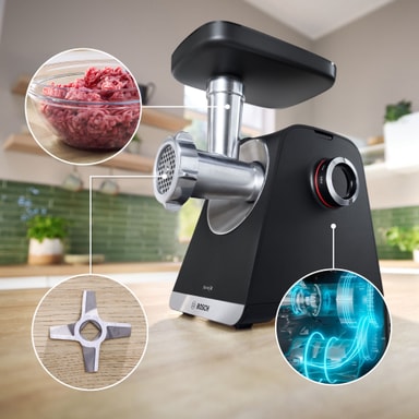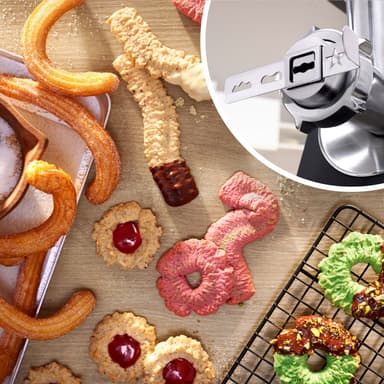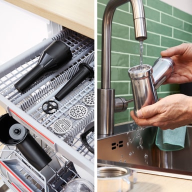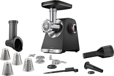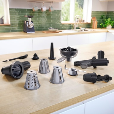 Alla tillbehör, kniven, mataren, diskarna, hackaren och kakformerna är diskmaskinssäkra. De metalliska delarna kan rengöras under rinnande vatten med den medföljande rengöringsborsten.