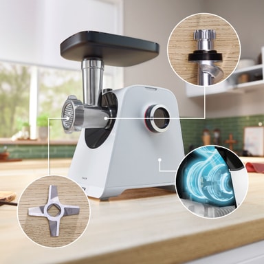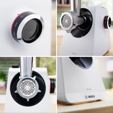 1900w Bosch Series 4 köttkvarn MFWS420W bearbetar upp till 2,5 kg/min, med två hastigheter, reversfunktion och en 12 cm hög kammare för stora skålar. Den har smart förvaring, diskmaskinssäkra delar och praktiska tillbehör.Läs mer om produkten