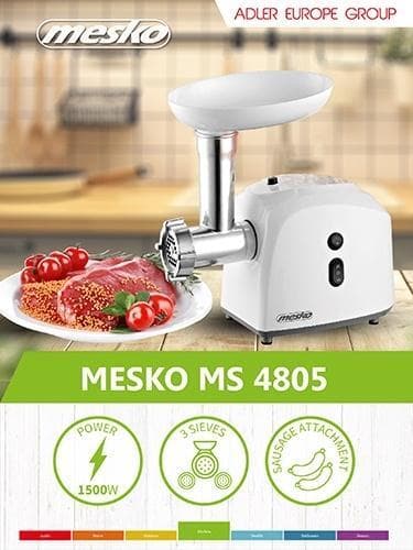 Dessutom ingår ytterligare tillbehör som en kolv och ett korvfyllmedel i uppsättningen. Kvarnen kan användas i båda riktningarna. Köttkvarnen Mesko MS 4805 har 1500W i effekt.