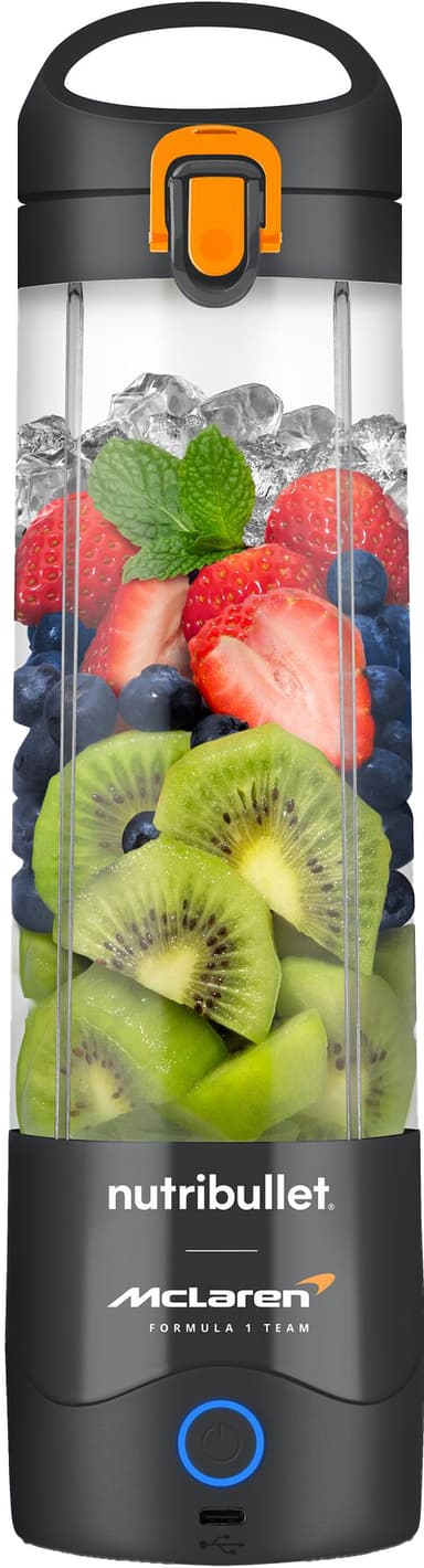 Nutribullet McLaren blender NBP003GO-MC är en USB-C-laddningsbar, kompakt blender med 475 ml behållare, stålblad, och handtagslock. Har McLarens färger, över 15 blandningar/laddning, idealisk för drycker på språng.Läs mer om produkten