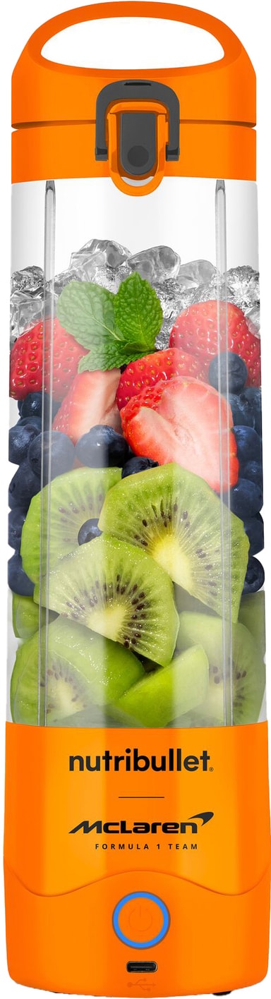Nutribullet McLaren blender NBP003PA-MC är en USB-C-laddningsbar, kompakt blender med 475 ml behållare, stålblad, och handtagslock. Har McLarens färger, över 15 blandningar/laddning, idealisk för drycker på språng.Läs mer om produkten