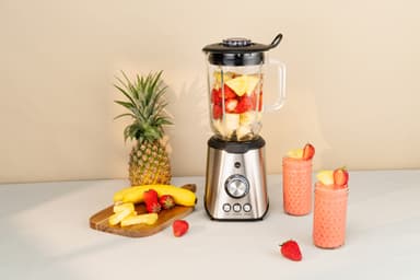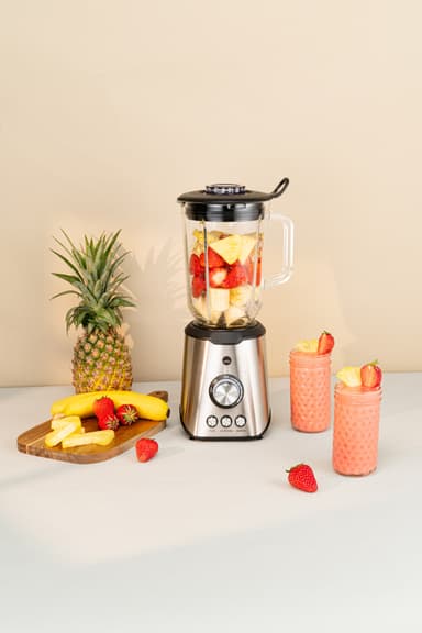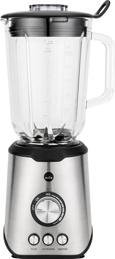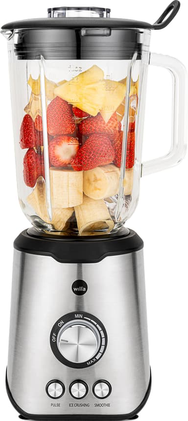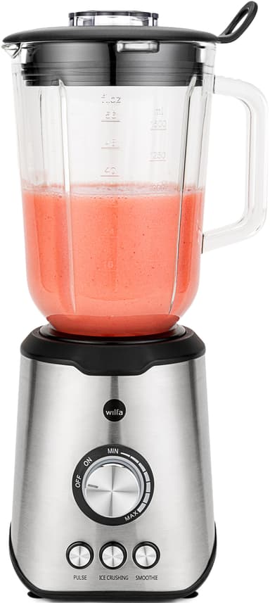 1000-watts Wilfa blender BLPS-1000 har en 1,5-liters glasskål och hanterar frukt, grönsaker, nötter och is med lätthet. Den erbjuder steglös hastighetskontroll, tillsammans med turbo- och pulsfunktioner för mångsidig och effektiv blandning.Läs mer om produkten