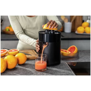 • Få färskpressad juice varje morgon Optimalt utbyte av fruktjuice tack vare olika storlekar på pressarna Välj mellan fruktkött eller ej Häll utan att spilla på sidan Stabil och halksäker Minimalistisk design