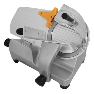 Den inbyggda knivslipen håller 430-bladet i rostfritt stål skarpt och skärningen helt exakt. Denna kraftiga skärmaskin står stadigt under drift tack vare sina robusta halkfria fötter. Oavsett om du använder denna enhet hemma eller i en kommersiell miljö, är detta den perfekta maskinen för jobbet.