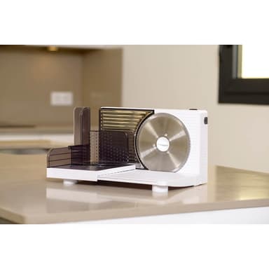Skiva kött, charkuterier, grönsaker, bröd, ostar, frukt och mycket mer med Cutmaster. Med sitt 17 cm blad i rostfritt stål och säkerhetsmatare kan du skiva alla typer av livsmedel till önskad tjocklek mellan 1-15 mm i total säkerhet. Njut av snabb, exakt, säker skivning med Cutmaster och glöm den traditionella skärbrädan och kniven.