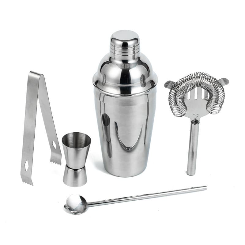 Elegant och praktisk design: Den eleganta silverfinishen ger en touch av sofistikering till alla baruppsättningar. Shakerns ergonomiska design säkerställer ett bekvämt grepp och enkel skakning, medan det medföljande stället håller alla verktyg organiserade och lättillgängliga.