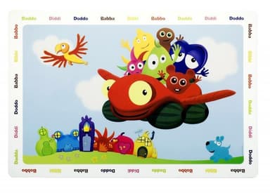 En bordstablett med Babblarna-tema som man kan ställa sin tallrik och sitt glas på så att man inte spiller direkt på bordet eller duken. Den har ett motiv av babblarna som flyger i ett flygplan över grönt gräs och över deras färgglada hus med en molnig sky i bakgrunden. Bredvid flyger en fågel och en hund springer efter dem på marken bakom dem. Bordstabletten är gjord av plast som är enkelt att göra rent.