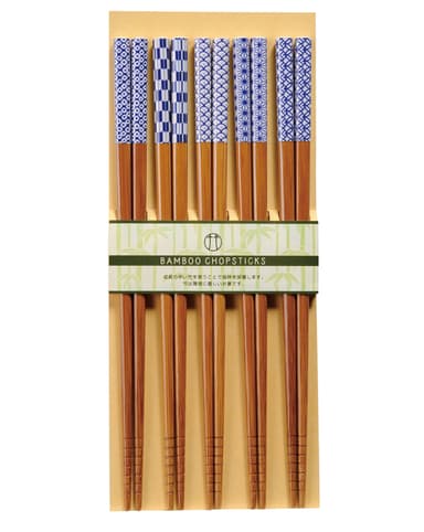 Set med fem par ätpinnar med grafiskt mönster i blått och vitt. Tillverkade i Japan av bambu med polyesteröverdrag. Pinnarna kan diskas i maskin.Läs mer om produkten